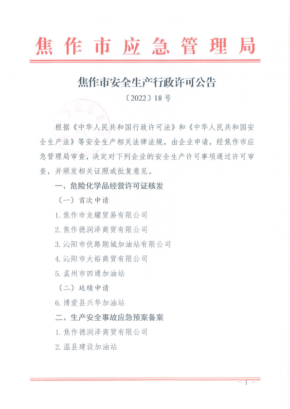 焦作市安全生产行政许可公告(〔2022〕18号)