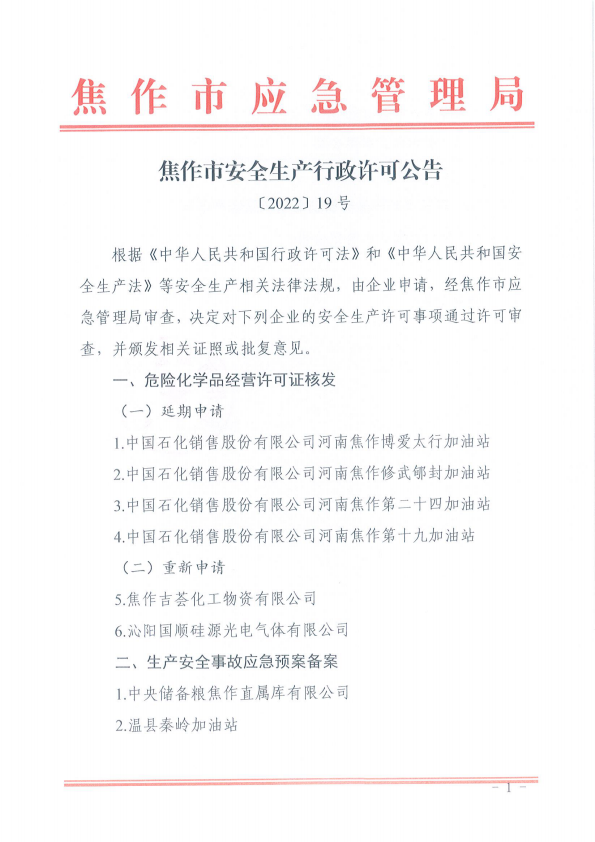 焦作市安全生产行政许可公告(〔2022〕19号)