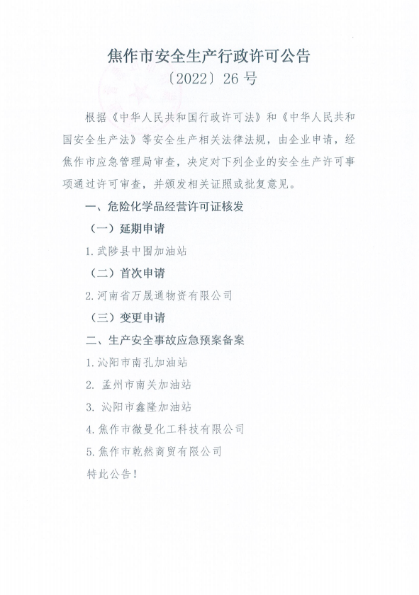 焦作市安全生产行政许可公告(〔2022〕26号)