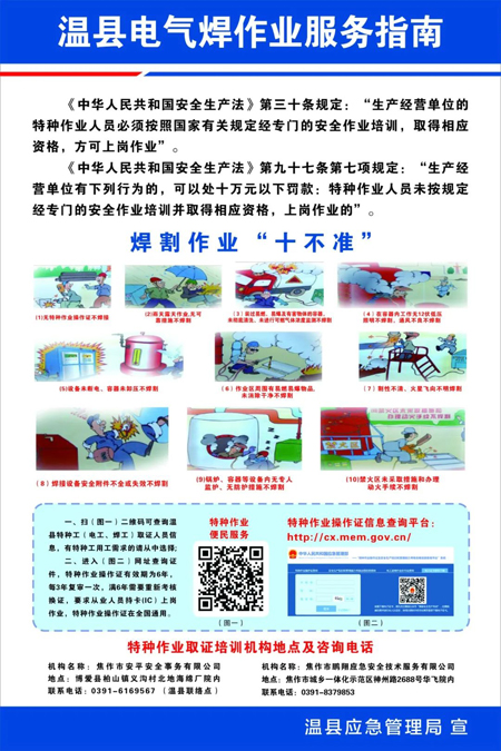 据了解,温县还利用“温县发布”“温县应急管理局”等公众号面向社会将电焊工持证人员名单进行公示,同时畅通举报渠道,引导社会共同参与监督,加大突击检查力度,对于无证上岗人员严肃处罚,始终保持高压态势,坚决防范事故发生。