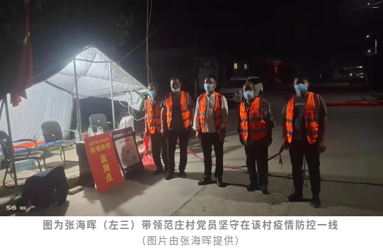 面对去年和今年的疫情,张海晖在范庄村和家庭之间的两次选择都是范庄村。他还将微信头像换成了“不忘初心、牢记使命”的图案,以此明志。其间,他坚持昼夜吃住在村里,带领范庄村全体党员、村组干部和大学生志愿者积极开展卡点值守、劝返外出群众等防疫工作,并协调解决该村鹌鹑饲养户的鹌鹑蛋滞销问题。在他的努力下,范庄村没有出现确诊病例。