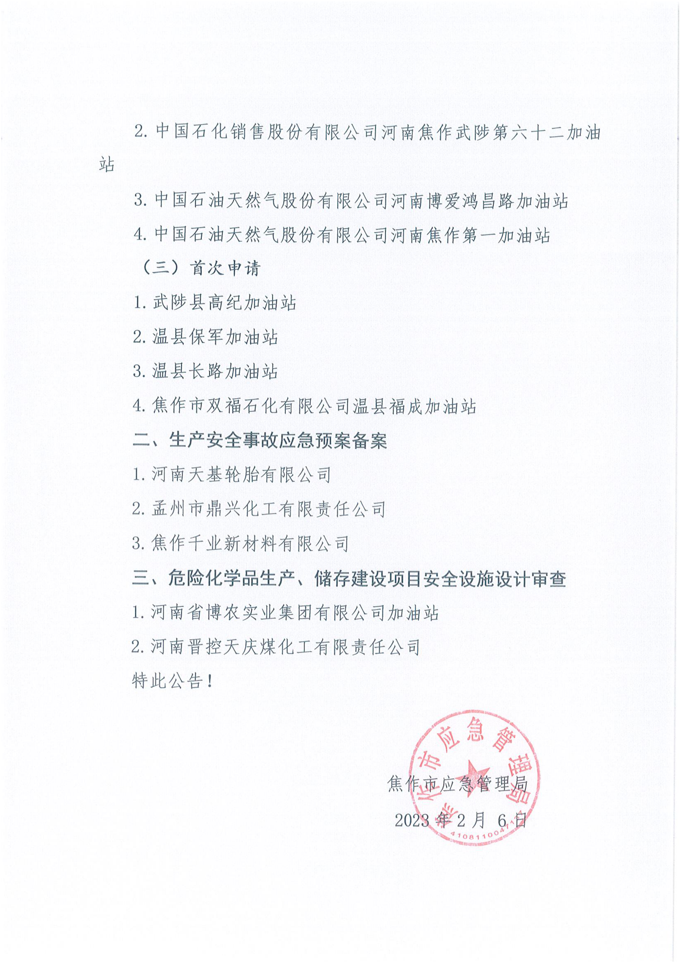 焦作市安全生产行政许可公告(〔2023〕4号)
