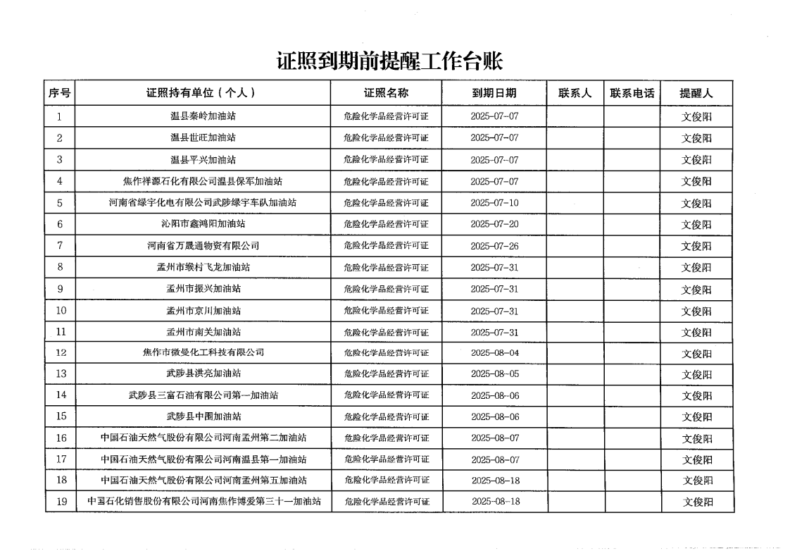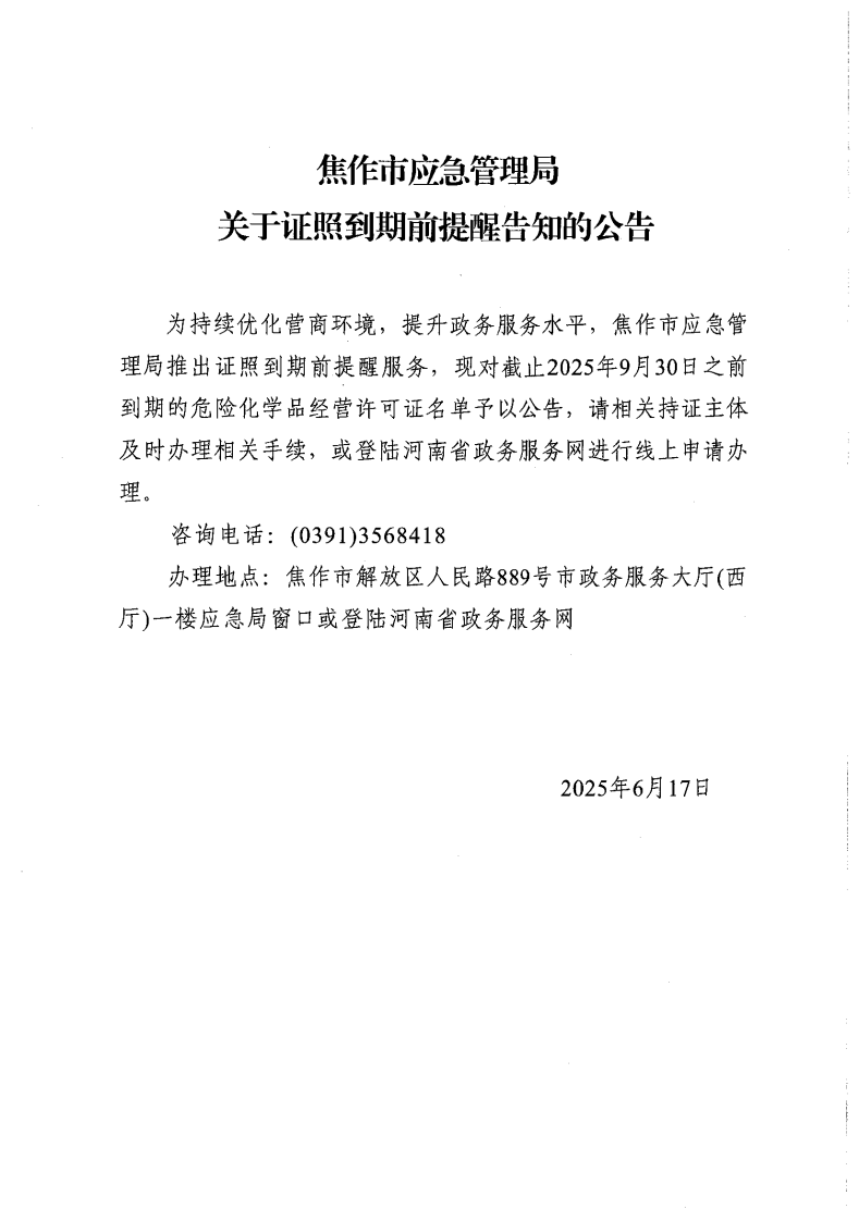 焦作市应急管理局关于证照到期前提醒告知的公告